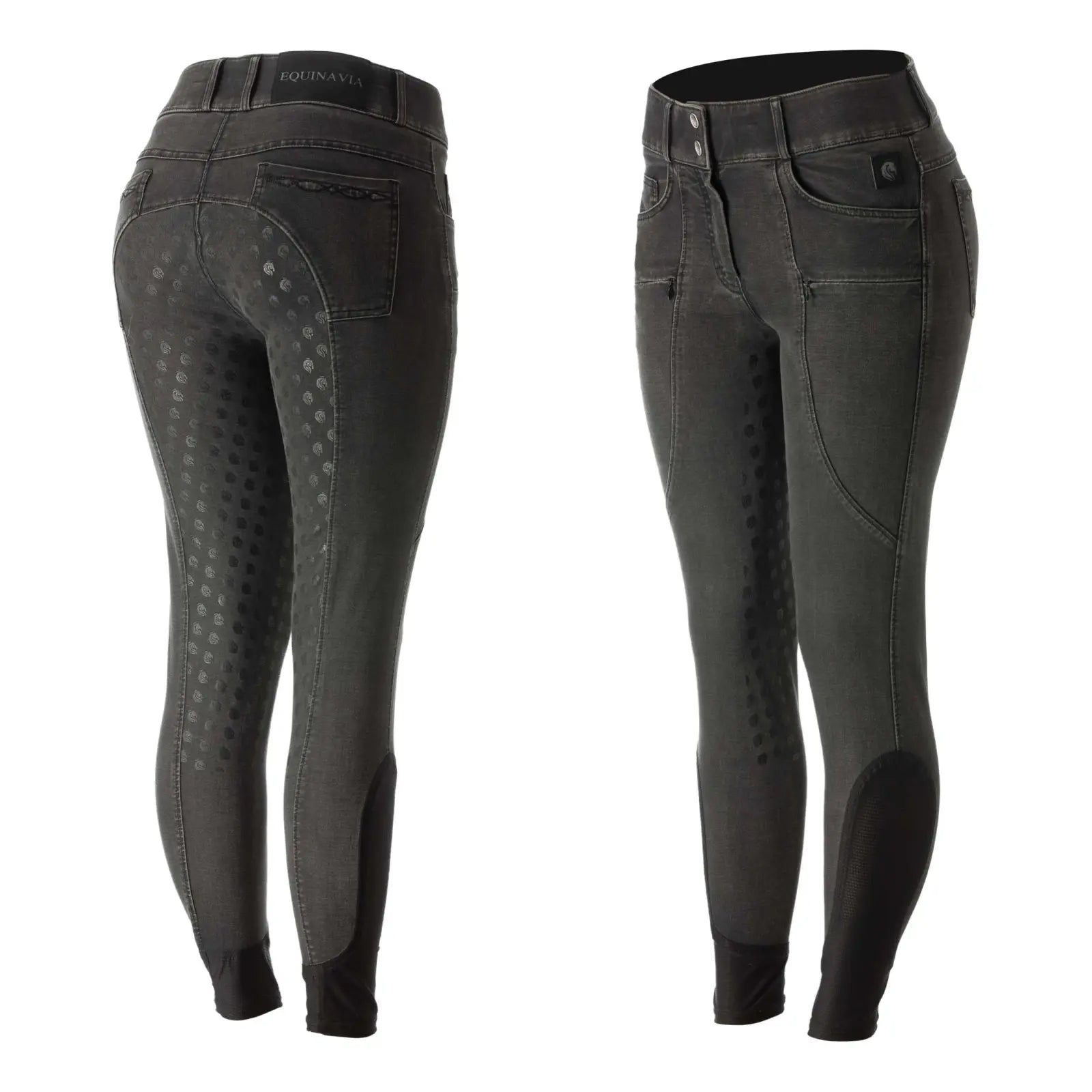The Equinavia Helena Women’s Denim Full Seat Breeches are made from a lightweight denim blend with plenty of stretch, offering all-day comfort and flexibility both in and out of the saddle. The mid-rise cut features a 2 1/4-inch waistband with double Gutos hook-slide closures for a secure yet unrestrictive fit. Classic 5-pocket styling is modernized with extra-deep front scoop pockets and two discreet zippered thigh compartments—both large enough to hold a smartphone. A silicone full seat ensures grip without bulk, while the mesh sock bottoms reduce pressure under tall boots. Finished with YKK zipper hardware and subtle, bridle-inspired back pocket stitching, these breeches strike the perfect balance between function and equestrian fashion.