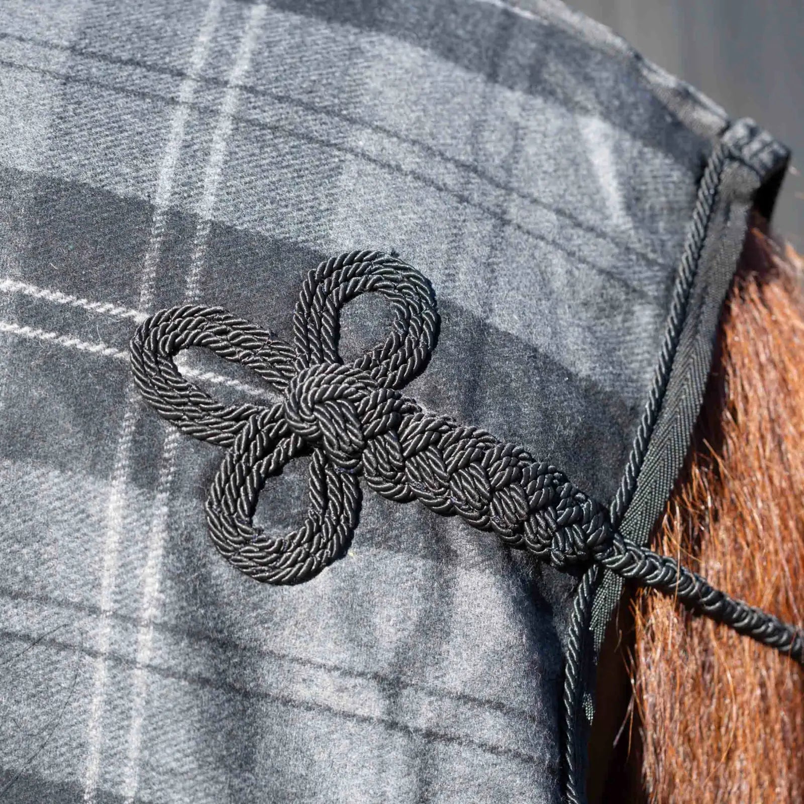 The Equinavia Ulla Wool Cooler is a premium heavyweight dress sheet crafted from 100% wool, offering exceptional warmth, breathability, and timeless equestrian style. Ideal for use after training sessions, during cool-down periods, or while waiting ringside at shows, this classic cooler provides both function and sophistication. The contoured design features carefully placed darts over the hips for an improved anatomical fit, allowing it to drape naturally over the horse’s body. A luxurious fleece shawl collar adds a refined touch while helping to block drafts around the shoulders and withers. Thoughtfully detailed with a stylish T-hook front closure secured by faux leather chapes, a hidden single surcingle for a clean silhouette, and a braided tail cord with an ornamental hip detail.