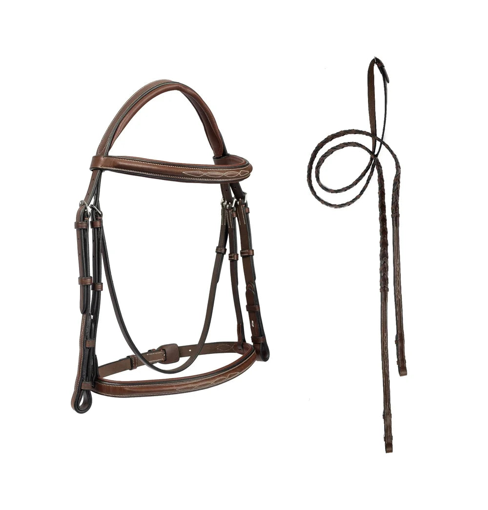 Hands down, the best selling bridle and an example of incomparable craftsmanship, this raised & padded bridle is carefully detailed with fancy stitching to enhance the look (even on the reins). The browband is 3/4″ and the standard noseband is 7/8″. Cheeks are 5/8″ with stainless steel hook studs. Bridle comes complete with Raised Fancy Laced reins. Available in Padded Mono or Standard Non-Padded Crown styles (as shown in photos). Brown only.
