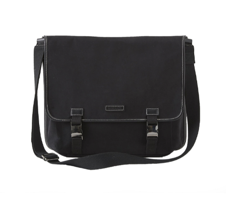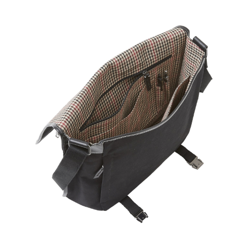 Sloan Messenger available in canvas lined with orange polyester. Brushed microfiber lined with cotton tattersall plaid. Both trimmed in Italian leather. Main compartment has zipper pocket and multiple slip pockets. 15 inch zipper laptop pocket on back for easy access. Front has a hidden zipper pocket. Canvas has plastic push lock closure and brushed microfiber has gunmetal push lock closure. 16 ½" x 4 ¼" x 13"