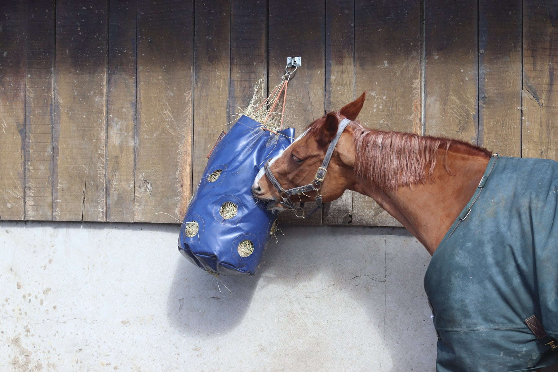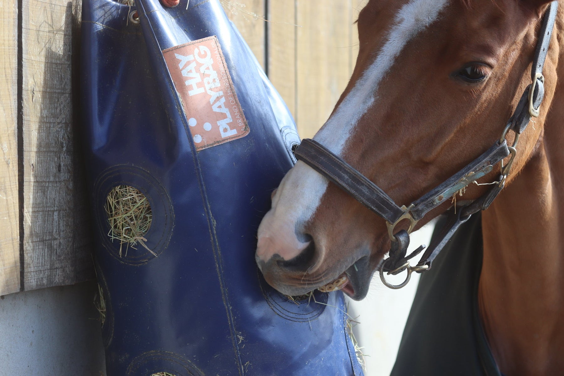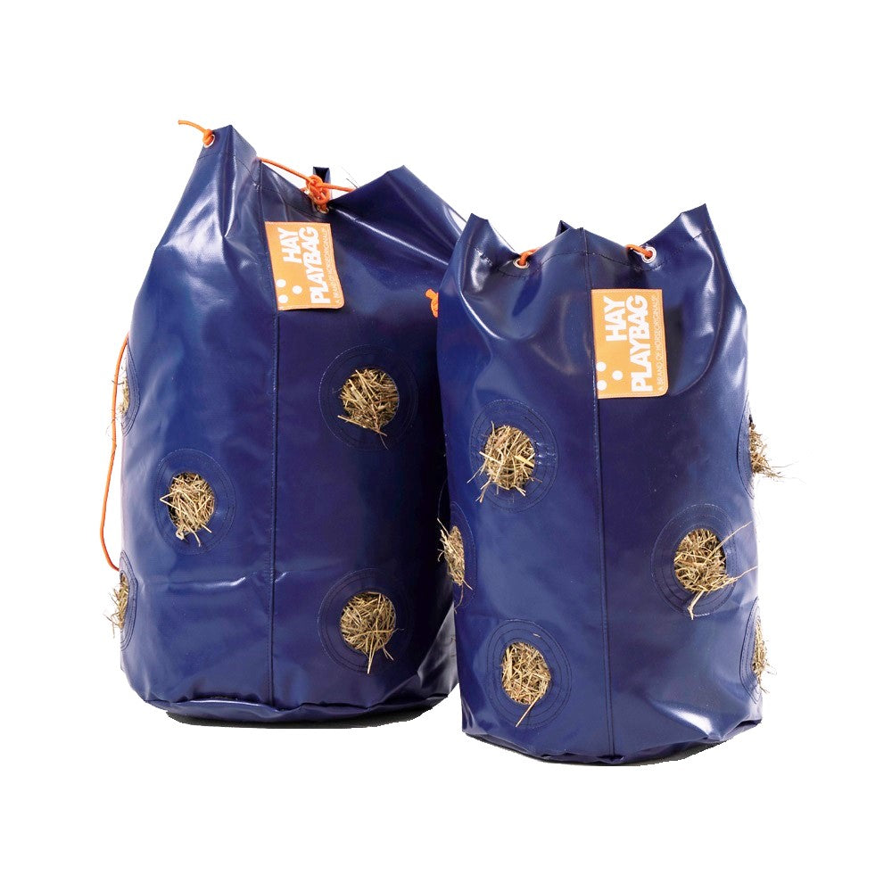 Non-toxic, ultra-durable, easy-fill, slow-feed hay bags that can be hung in stalls / trailers, used as a ground-feeding enrichment toy (see: how to tie your bag safely for ground feeding), or as part of a track system. Useful for horses, donkeys, sheep, and goats.