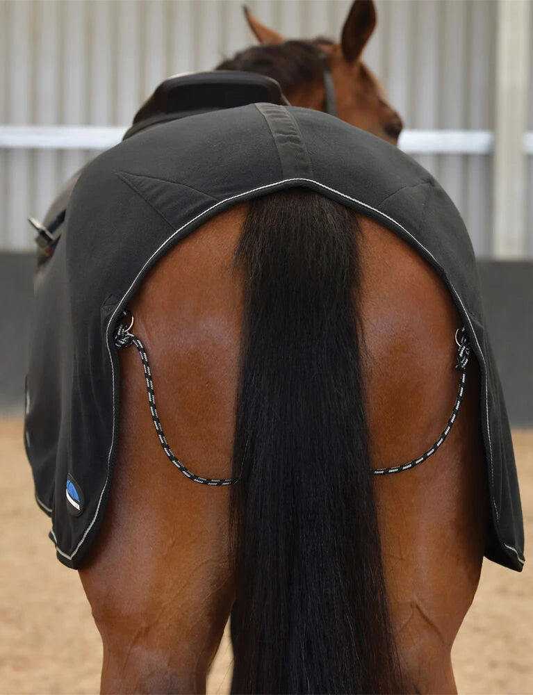 The WeatherBeeta Anti-Static Fleece Quarter Sheet is a lightweight horse exercise sheet ideal for use on colder days, designed to keep your horse's major muscle groups protected from the chill of colder weather when exercising. The WeatherBeeta Exercise/Quarter Sheet is made from a fleece fabric that draws moisture away from the horse's body while maintaining warmth. This quarter sheet wraps around the saddle and secures with a touch tape front closure at the wither, making for easy on/off, even during exercise. The sweeping hemline ensures that there is no interference with the riders leg position and the tail cord helps to keep the quarter sheet in place and prevent flapping during exercise. The polyester fleece fabric features anti-static technology which prevents your horse getting shocked from static electricity as well as being anti-pill, preventing the fleece fabric from bobbling.