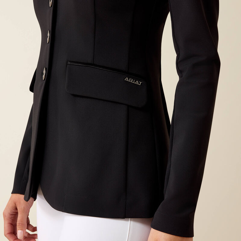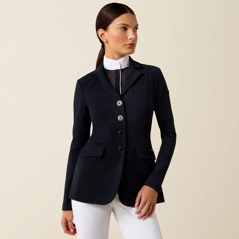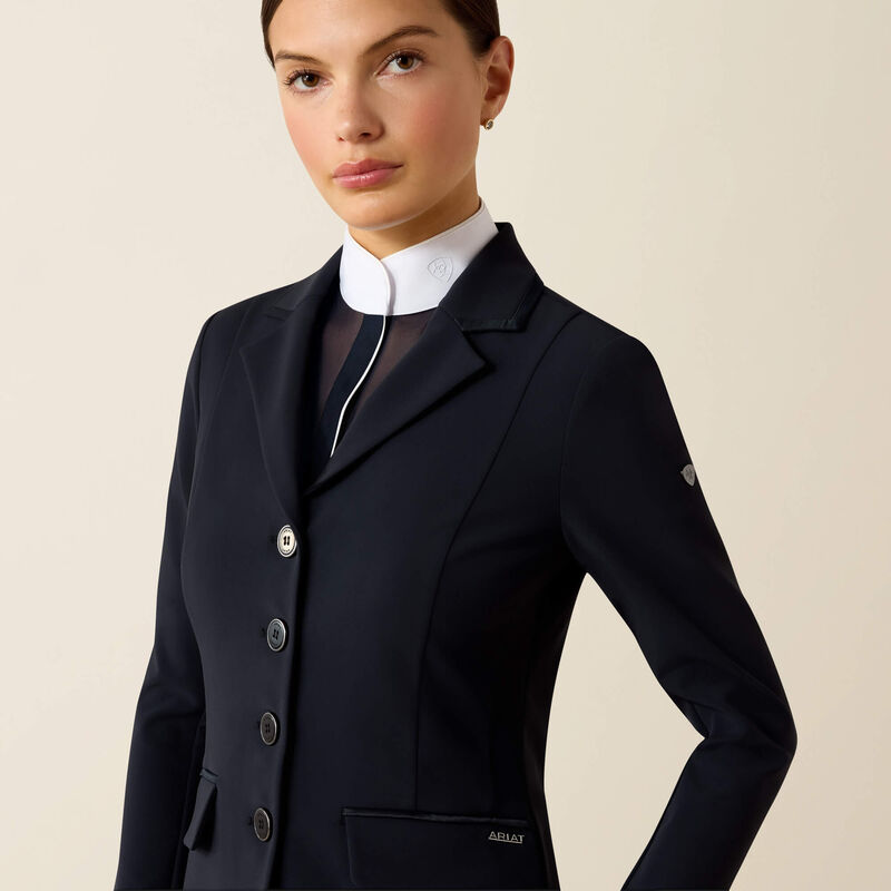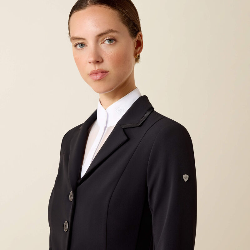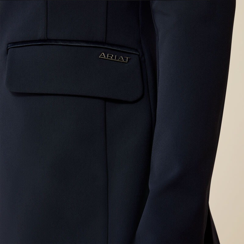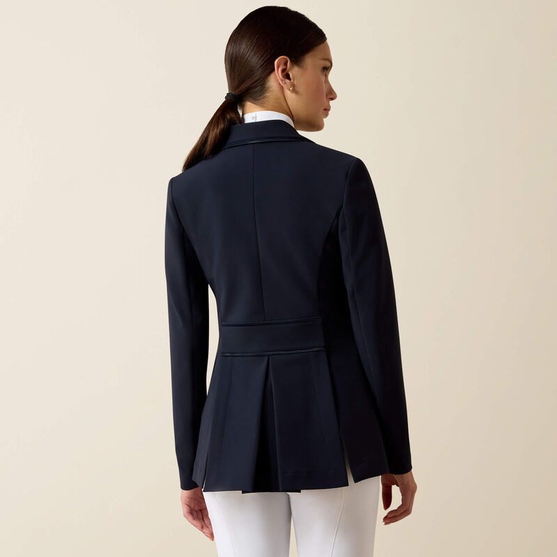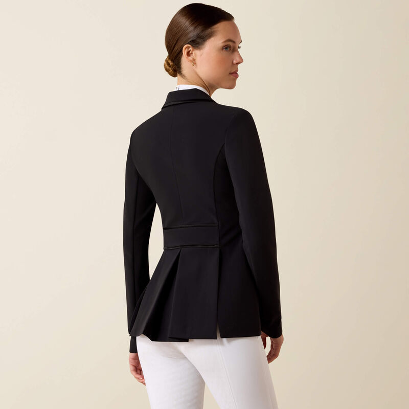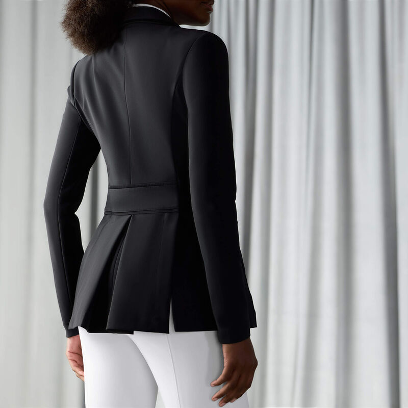 This beautiful show coat is the cornerstone of our Allure Collection. Elegant, meticulously crafted, and unmistakably feminine, with subtle satin piping and the perfect amount of stretch. A refined box pleat and shaping at the waist will flatter your shape and wow the judges.