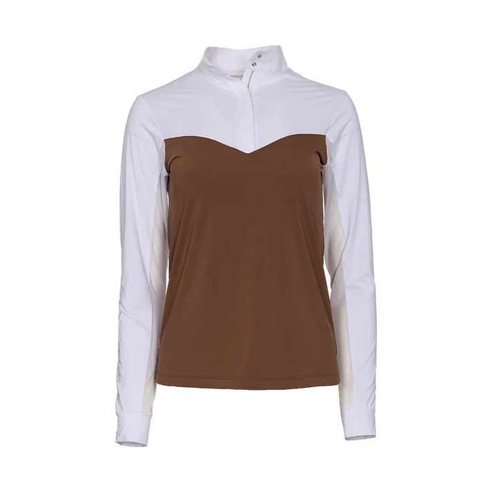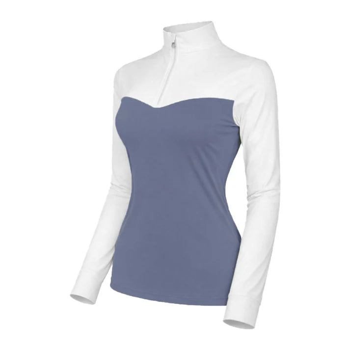 The Lady Show Top is a refined extension of our best-selling Lady silhouette—designed specifically for the show ring and now offered in a seasonal color palette that coordinates beautifully with our collections. With its crisp white upper, elegant design, and discreet covered zipper, it delivers a clean, polished look that stays perfectly classic under any show coat. Thoughtfully constructed so only white is visible when your jacket is on, this top blends show-day formality with the same cooling, ice-feel fabric and flattering color block design our customers love. Mesh underarms add breathability without compromising elegance, while the soft cuff finishes the look with comfort and simplicity.