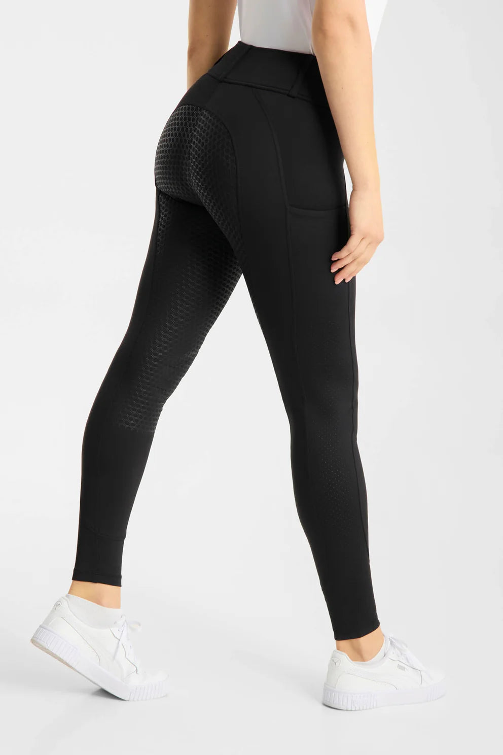 These full-seat riding tights are made from functional, breathable fabric and are designed to provide a light and comfortable wearing feel. Perforated areas support air circulation and help maintain a balanced climate while riding. Pockets on the thighs offer space for a mobile device, while two snap buttons and belt loops complete the clean, sporty look.