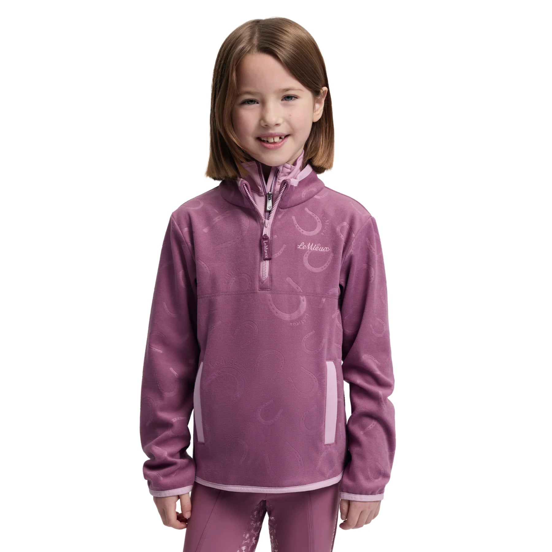 This stylish fleece features a unique debossed horseshoe print throughout, offering a subtle yet sophisticated equestrian look. Designed for practical warmth, it includes a half-zip closure with a vibrant contrast lining and matching contrast welt pockets. The collar, hem, and cuffs are finished with durable bindings to ensure a secure fit and long-lasting wear, making it a perfect mid-layer for active days at the stable.