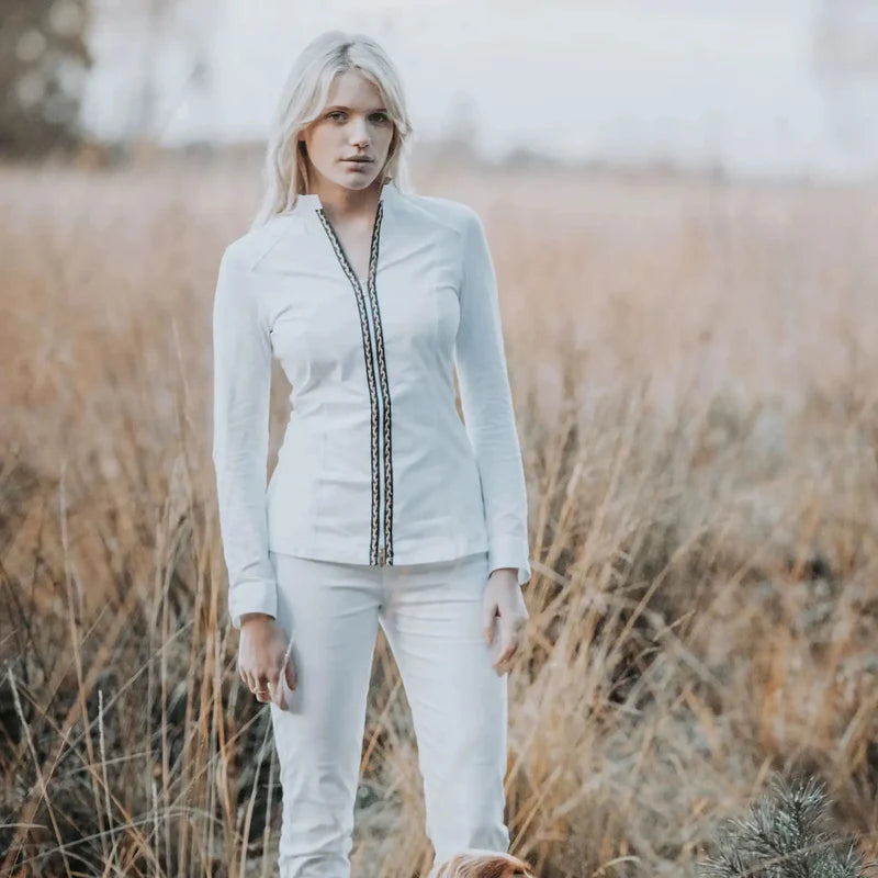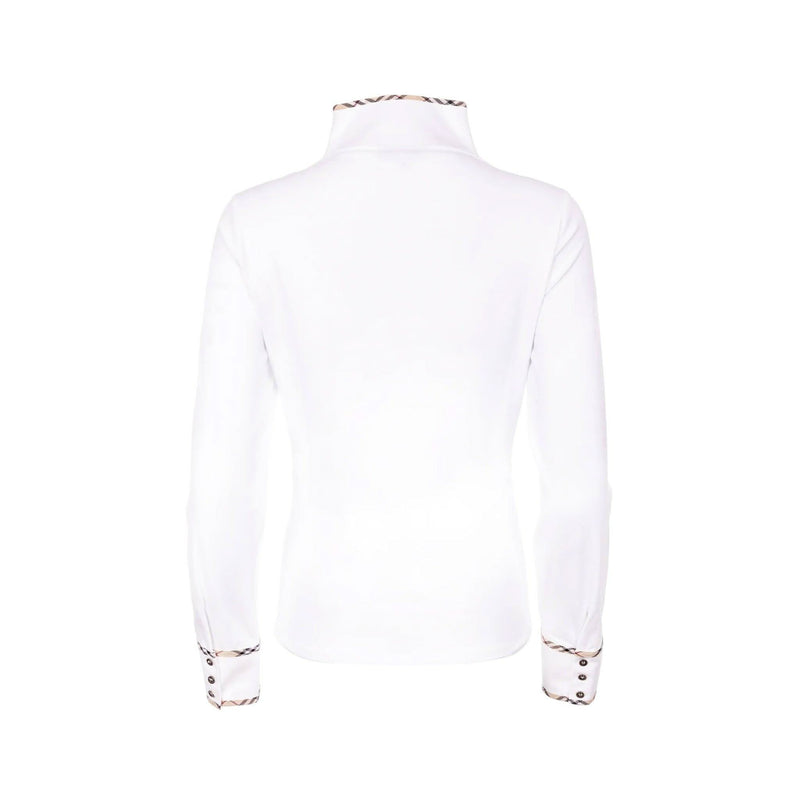 Our Phoebe Stripe Shirt is a uniquely tailored piece of WG and are one of our favourites as they are a smart casual comfortable white shirt. The structured front shapes the shirt beautifully and the cotton stretch on the back and sides ensures ultimate comfort. This women's shirt has a zip fastening on the front for a modern twist and the higher collar transform this into an elegant staple. The Burgundy Check detailing on the front seams, collar and cuffs brings the outfit together delightfully.
