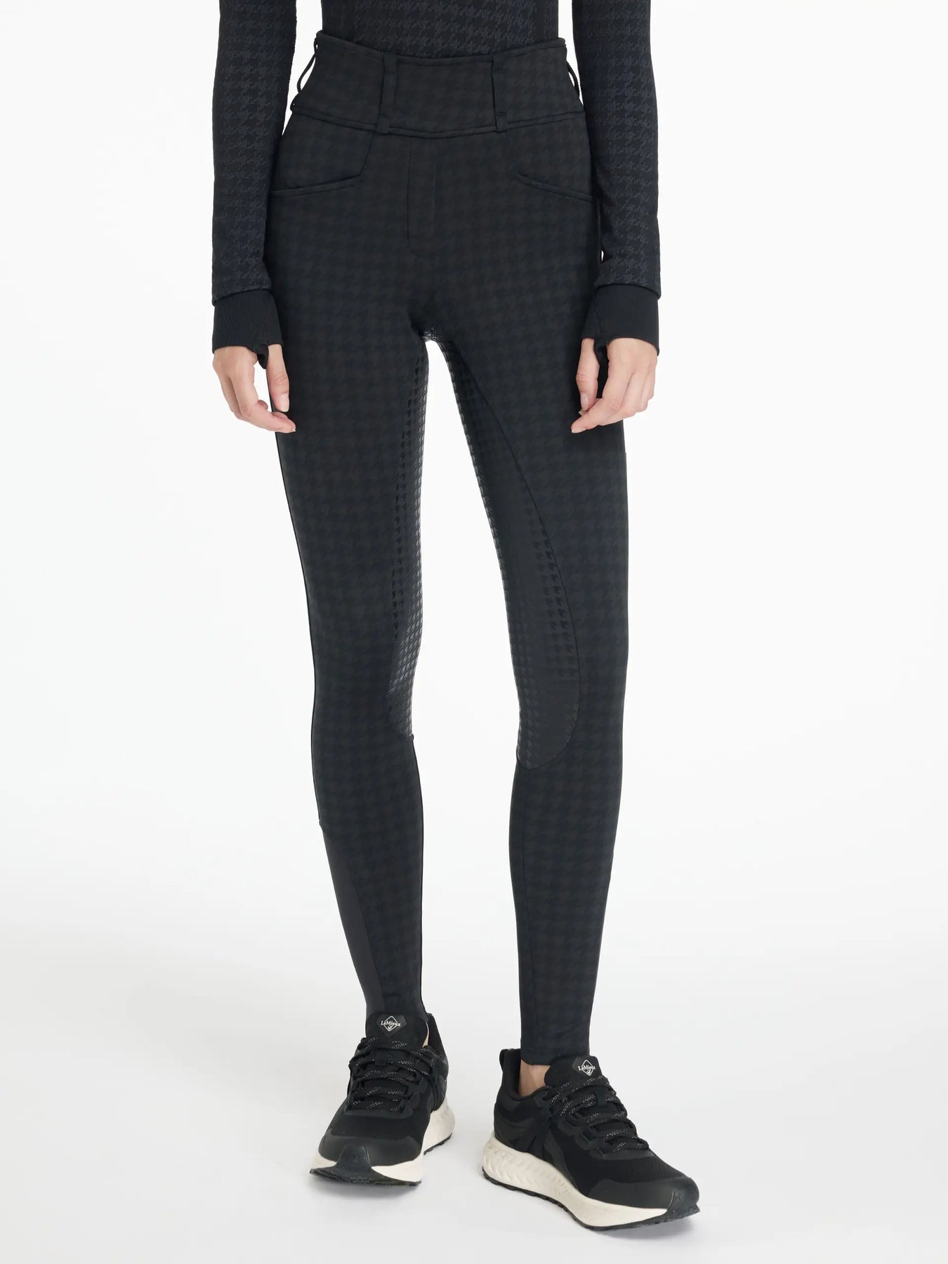 Full-seat houndstooth print silicone offers grip for stability and security in the saddle. The LeMieux branded lower leg is laser cut to reduce bulk under boots.