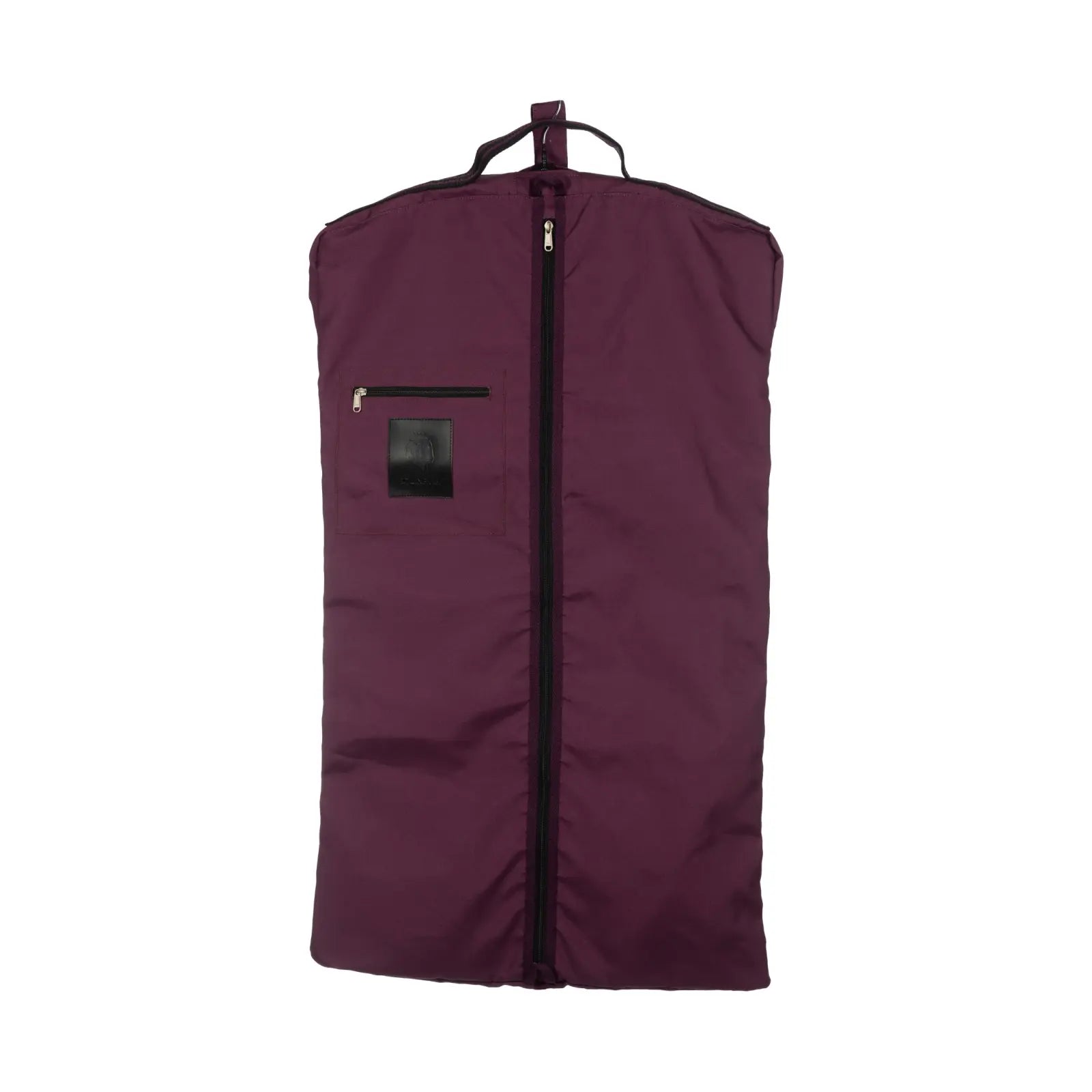 The Equinavia Darby Garment Bag is designed to hold most show coats. It features a large front zipper for easy access, a small front pocket for pins and accessories, a top handle, and a hanger slot for added convenience.