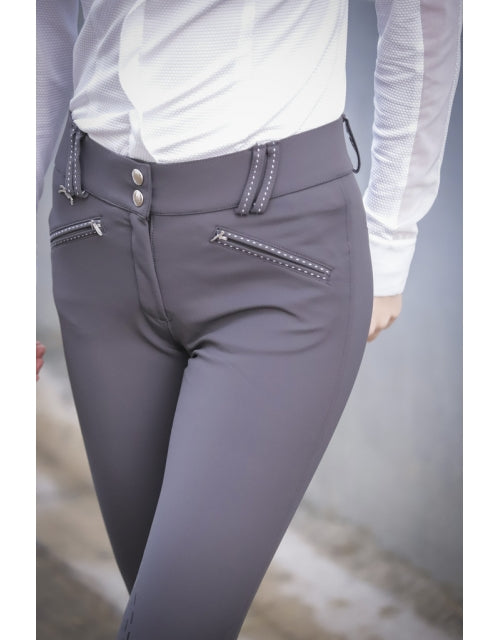 The heather gray Romy breeches are extremely comfortable thanks to their particularly stretchy, close-fitting fabric. They feature two front zipped pockets and a slightly wide, snug-fitting waistband. Its Lycra lower legs adapt to a wide range of body shapes. Its original heather gray color will cause a sensation at the stables.