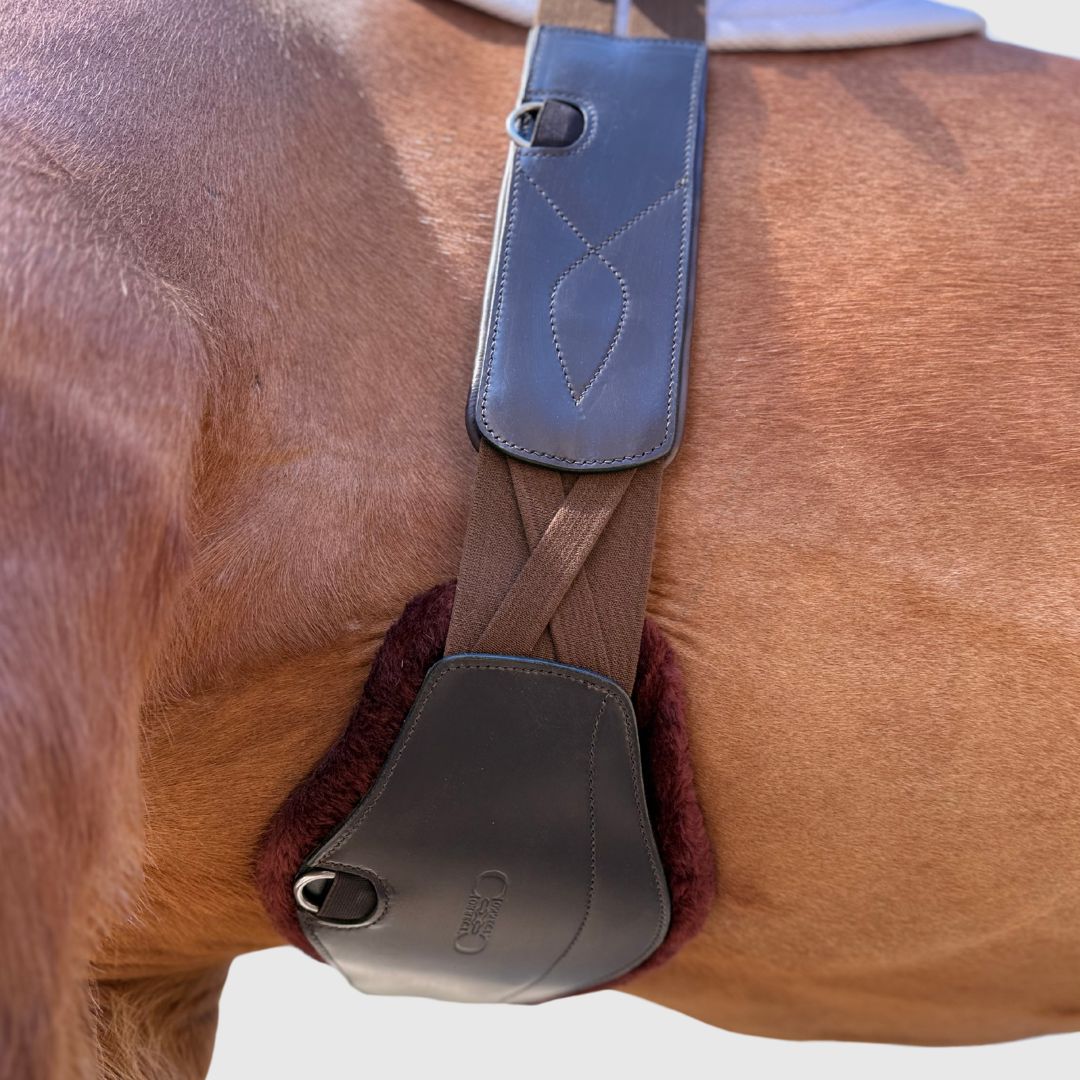 We designed the Pressure Relief Comfort Long Girth with the horse in mind. Thick, washable faux sheepskin (Included) covers the sternum to relieve pressure points, and it holds the elastic away from sensitive areas along the rib cage. The fleece pad is included with the girth.
